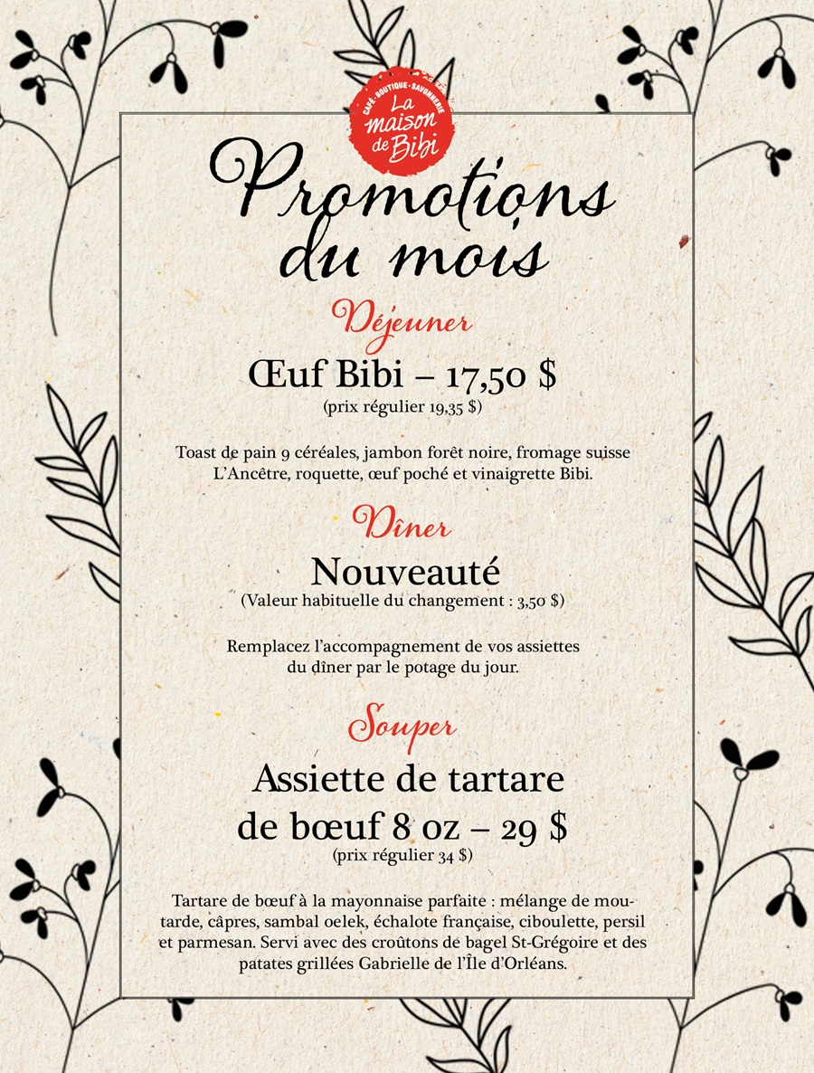 Restaurant chaleureux, convivial et décontracté où tous les membres de la famille sont les bienvenus. Bibi aime bien laisser toute la place aux produits du terroir lorsqu’elle élabore ses menus. Des déjeuners gourmands , des diners et des soupers feront le bonheur de tous!